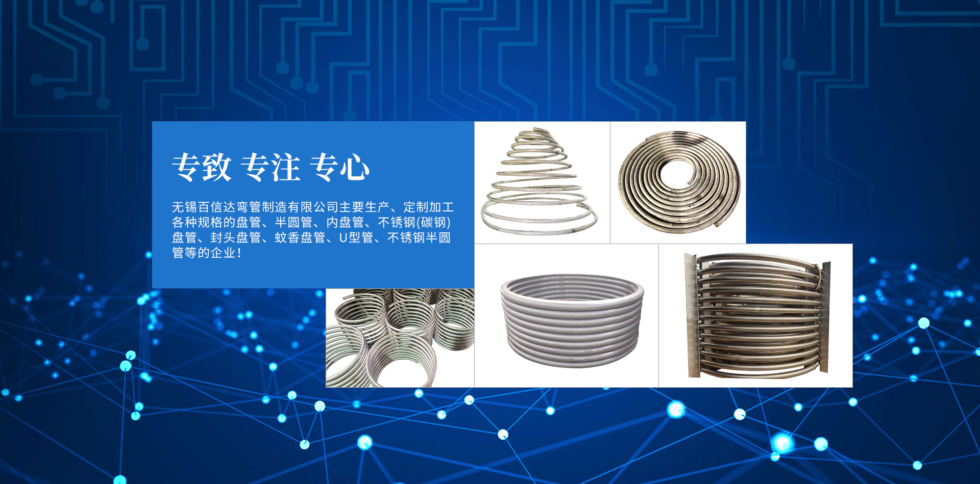 無(wú)錫百信達(dá)彎管制造有限公司位于經(jīng)濟(jì)發(fā)達(dá)、風(fēng)景秀麗的太湖之濱。本公司擁有完整、科學(xué)的質(zhì)量管理體系,公司的誠(chéng)信、實(shí)力和產(chǎn)品質(zhì)量獲得業(yè)界的認(rèn)可。公司專(zhuān)注生產(chǎn)、定制加工各種規(guī)格的盤(pán)管、半圓管、內(nèi)盤(pán)管、不銹鋼盤(pán)管、封頭盤(pán)管、蚊香盤(pán)管、U型管、不銹鋼半圓管、碳鋼盤(pán)管等的企業(yè)。本公司設(shè)計(jì)加工的彎管設(shè)備,質(zhì)量精良、結(jié)構(gòu)合理,效率高、操作簡(jiǎn)易、經(jīng)久耐用。公司已經(jīng)承接了各地多個(gè)大型場(chǎng)館工程項(xiàng)目的彎管加工,屢次得到了多家大客戶(hù)的好評(píng)。努力滿(mǎn)足客戶(hù)的需要,不斷提高自身水平是公司追求的目標(biāo)。歡迎社會(huì)各界朋友蒞臨無(wú)錫百信達(dá)彎管制造有限公司參觀(guān)、指導(dǎo)和業(yè)務(wù)洽談!